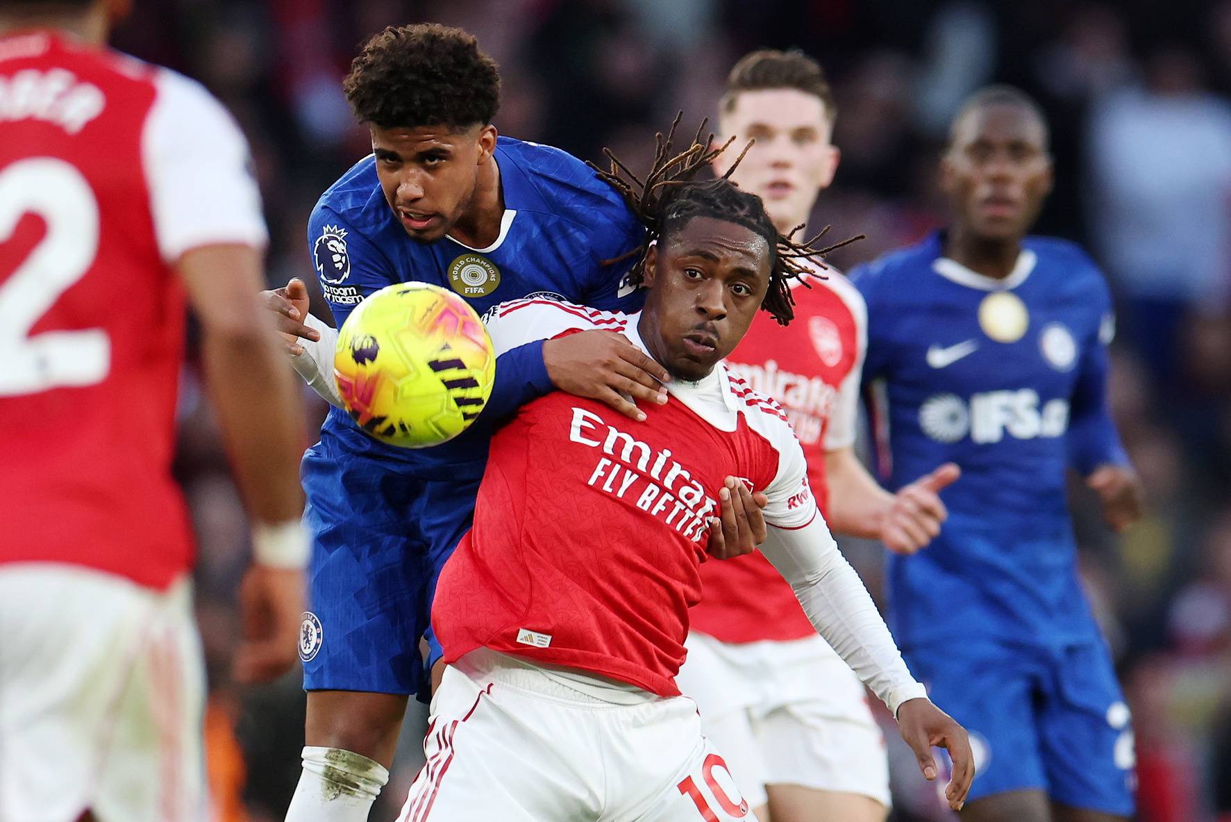 3月1日,阿森纳队球员埃泽(右)与切尔西队球员安德雷·桑托斯拼抢。 新华社/欧新